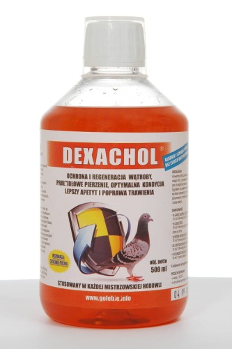 Dexachol to nowoczesny, skoncentrowany preparat oparty na formule biochemicznych katalizatorów oraz substancji lipotropowych dla prawidłowego funkcjonowania i ochrony wątroby u gołębi. Synergistycznie dobrane, aktywne składniki preparatu działają ochronnie, regenerująco i stymulująco na hepatocyty, zwiększają ich zdolności do usuwania toksyn i szkodliwych produktów przemian metabolicznych, jak również, przyczyniają się do poprawy trawienia i wykorzystania tłuszczów. Poprzez zawartość aminokwasów siarkowych, takich jak metionina, DEXACHOL korzystnie wpływa na niezakłócone wykształcenie upierzenia, jego wzmocnienie i prawidłową budowę przestrzenną. Dodatkowo pobudza metabolizm żelaza, wchłanianie witamin i glukozy oraz przyswajanie białek. Wzmaga apetyt i poprawia trawienie. Redukuje następstwa zatruć pokarmowych, ale także minimalizuje objawy przeciążeń organizmu ptaka, pojawiających się najczęściej w okresach wzmożonego wysiłku tj. w czasie rozpłodu, lotów i pierzenia. Konsekwencją stosowania preparatu jest utrzymanie prawidłowej równowagi fizjologicznej, a tym samym optymalnej kondycji i wydolności.