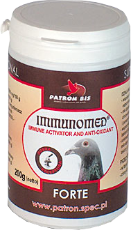 Preparat wspiera i stymuluje układ odpornościowy (limfatyczny), zapobiega rozwojowi infekcji (circowirozy, adenowirozy i paramyxowirozy). Ponadto wspiera wzrost i rozwój pożytecznych bakterii jelitowych wszystkich rodzajów oraz uniemożliwia lub ogranicza rozwój mikrobów chorobotwórczych w jelitach, takich jak E. Coli, Salmonella itp. W intensywnie prowadzonej hodowli, nastawionej także na uczestnictwo w lotach, zastosowanie dobrego immunostymulatora jest nieodzowne. Istnieje potrzeba wzmocnienia układu odpornościowego, aby mógł poradzić sobie z chorobotwórczymi bakcylami, poprzez rozwiniętą „pamięć immunologiczną”. Uzyskać to można, poprzez wcześniejszą immunomodulację gołębi, podając z karmą Immunomed Forte. Zawiera on kilka substancji aktywizujących system odpornościowy. Jako główną wskazujemy 1,3/1,6 D b-glucan, co potwierdzają niezależne laboratoria oraz Instytut Technologii Żywienia.