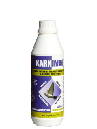Wspomaga przemianę materii i transport kwasów tłuszczowych długołańcuchowych. Znacząco podnosi wydolność mięśniową. Zapobiega zakwasom i skurczom mięśni. W intensywnie prowadzonej hodowli gołębi, nastawionej na wyczyn sportowy, preparat ten powinien być wyjątkowo doceniony. Umożliwia podniesienie i rozwój kondycji i formy u lotujących ptaków. L-karnityna spełnia rolę transportera długołańcuchowych kwasów tłuszczowych, które przekazywane są do mitochondriów, aby tam ulec przemianom, w wyniku których powstaje energia niezbędna dla komórek mięśniowych. L-karnityna jest więc doskonałym „spalaczem” tłuszczu zapasowego. W tym skomplikowanym biologicznym procesie wspomaga ją skutecznie witamina B5 (bez jej udziału proces jest upośledzony). Magnez jest ważnym pierwiastkiem niezbędnym przy przekazywaniu impulsów nerwowych do mięśni. L-karnityna wpływa pozytywnie na ruchliwość plemników. Podawanie KARNIMAGU w okresie rozrodu, szczególnie z SELEVITEM, ma ogromne znaczenie dla poprawy jakości zapłodnienia.