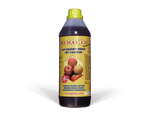 Preparat pomaga zachować właściwe pH w układzie pokarmowym, przyczynia się do rozwoju prawidłowej flory jelitowej oraz wykazuje działanie regulujące nadmierne namnażanie się bakterii E. coli. Medacid ogranicza rozwój pierwotniaków oraz wiciowca Trichomonad gallinae. Wzmacniajace działanie miodu ma wpływ na wzrost formy i witalności. Witamina C działa antystresowo oraz podnosi odporność. Medacid jest doskonałym połączeniem sprawdzonych naturalnych produktów stosowanych i uznanych w sporcie gołębiarskim. Ten produkt jest połączeniem miodu pszczelego (lipowy i akacjowy) oraz octu jabłkowego, wzbogaconego o kwas askorbinowy (wit. C). Ocet jabłkowy uznany został przez hodowców na całym świecie już od bardzo wielu lat. Także WIELCY ZWYCIĘZCY bitew i wojen w dawnych czasach, zaopatrywali swoich wojów w napój zawierający rozcieńczony ocet jabłkowy, aby ustrzec ich przed chorobami. Medacid poprzez właściwości octu oddziałuje silnie kokcidiobójczo, a poprzez walory miodu wzmacniająco. Medacid to NATURALNIE dobre połączenie.